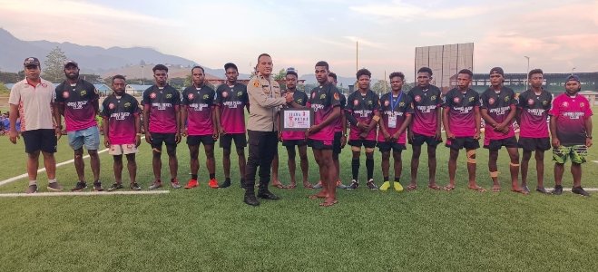 Caption foto : Yoram Kreku Kapten Rugby Distrik Waibu menerima Palakat diserahkan Ipda Daniel Z Rumpaidus SH. MH.