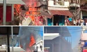 TUMPAAN, KLIKJO.ID–Rumah Toko (Ruko) dua unit masing-masing dua lantai milik Janda Lance dalam Keluarga Dotulong-Liem, di kawasan pertokoan, Desa Tumpaan Satu, Kecamatan Tumpaan, Kabupaten Minahasa Selatan (Minsel), Sulawesi Utara hangus terbakar.