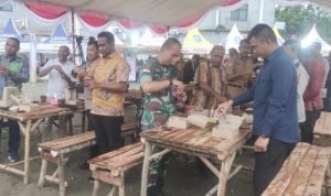 Festival : Kapolres Jayapura AKBP Fredrickus W. A. Maclarimboen, S.IK., M.H, bersama Pj Bupati Jayapura Triwarno Purnomo, S.STP., M.Si membuka festival colo sagu dengan mencelupkan sagu ke gelas kopi.(Foto: Ars)