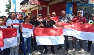 Bendera : Pj Bupati Kabupaten Jayapura Triwarno Purnomo, S.STP., M.Si., Bersama Jurnalis Kabupaten Jayapura mebagikan Bendera Merah Putih di jalan Poros kota Sentani.(Foto: ARS)