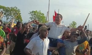 Diaralk : Bukti kecintaan warga Paslon JMW – DM digendong sambil diarak di lapangan Sentani Abepura, Hawai usai deklarasi bersama.(ARS)