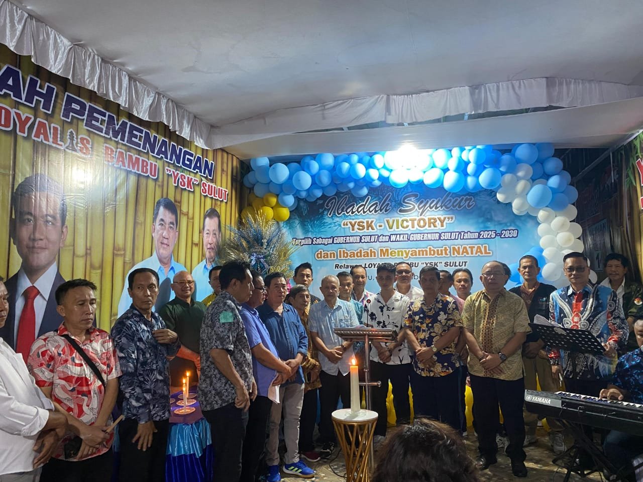 MANADO, Klikjo.id –Relawan Loyalis Bambu Pasangan calon gubernur dan wakil gubernur Sulawesi Utara terpilih, Yulius Selvanus Komaling-Victor Mailangkay (YSK-VM) menggelar ibadah syukur terpilihnya YSK-Victory sebagai Gubernur dan Wakil Gubernur Sulut periode 2025-2030, dan ibadah menyambut Natal Yesus Kristus, di Rumah Pemenangan YSK-Victory, Jalan Pumorouw Manado, Sabtu (07/12/2024).