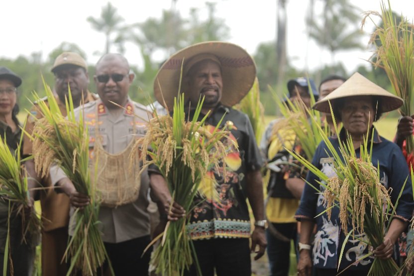 Panen : Bupati Jayapura Dr. Yunus Wonda, SH., MH., didampingi Kapolres AKBP Umar Nasatekay, S.I.K., Wakil Ketua II DPRK Petrus Hamokwarong, Plt Kadis Tanaman Pangan dan Holtikuktura, Delila Giay, Kepala Distrik Kemtuk dan tokoh adat melakukan panen perdana jagung dan padi ladang di Kampung Sekori dan Kampung Skoaim Distrik Kemtuk.(Foto: Ist)