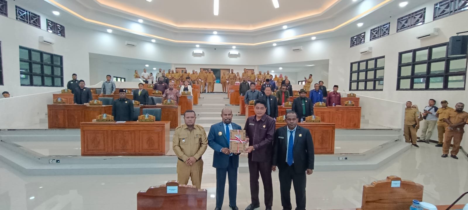 Paripurna : Bupati Jayapura Yunus Wonda saat menyerahkan LKPJ Bupati Jayapura 2024 kepada pimpinan DPRK, di ruang sidang DPRK Jayapura.(Foto: ARS)