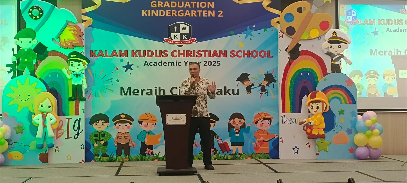“Penamatan tahun ini merupakan yang ke-22 sejak TK Kristen Kalam Kudus Sentani berdiri. Saya sangat bersyukur karena bahkan ada alumni angkatan pertama yang kini menjadi pengajar di sekolah ini,” ujarnya. Stephen juga menyampaikan bahwa saat ini pihak yayasan sedang membangun gedung baru dua lantai untuk TK KKK Sentani.