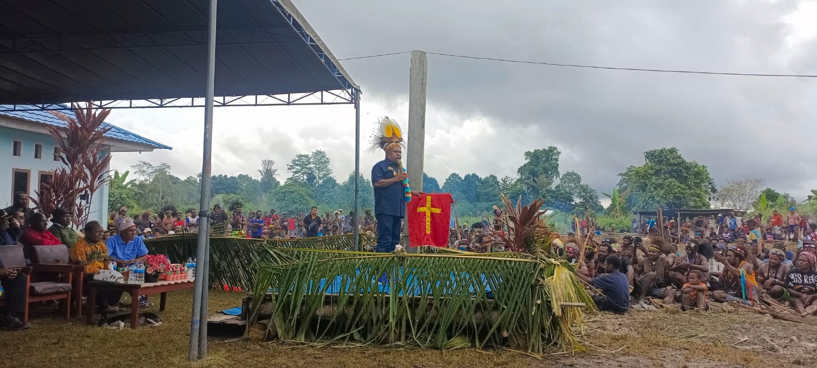 Sambutan : Bupati Jayapura Yunus Wonda menyampaikan sambutan di halaman Gereja GIDI, Kampung Lapua, Juk Sinarmas, Distrik Kaureh, saat kunjungan kerja bersama OPD, Jumat (11/7/2025).(Foto: ARS)