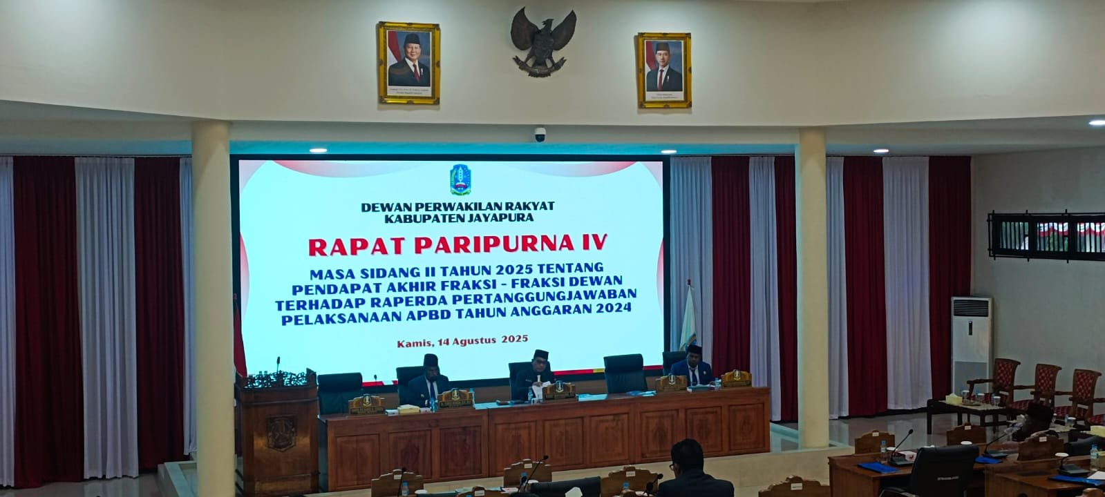 SENTANI, Klikjo.id –Dewan Perwakilan Rakyat Kabupaten (DPRK) Jayapura menggelar Rapat Paripurna IV Masa Sidang II Tahun 2025, pada Kamis (14/8/2025), agenda penyampaian pendapat akhir fraksi terhadap Rancangan Peraturan Daerah (Ranperda) Pertanggungjawaban Pelaksanaan APBD Tahun Anggaran 2024.