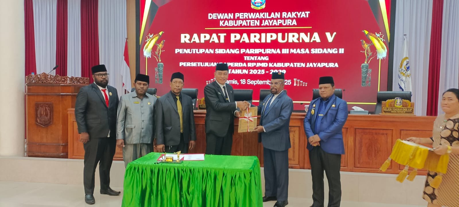 SENTANI, Klikjo.id –Dewan Perwakilan Rakyat Kabupaten (DPRK) Jayapura menetapkan Rencana Pembangunan Jangka Menengah Daerah (RPJMD) Kabupaten Jayapura Tahun 2025–2029 menjadi Peraturan Daerah (Perda) Nomor 19 Tahun 2025, melwlui rapat paripurna penutupan sidang III, dipimpin Ketua DPRK Jayapura, Ruddy Bukanaung, di ruang sidang DPRK Jayapura, pada Kamis (18/9/2025).
