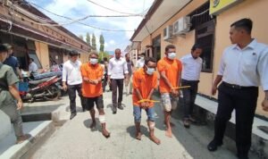 Digelandang: Tiga tersangka dugaan kasus begal yang menewaskan pengemudi ojek online di Kampung Nendali, berhasil dilumpuhkan dan digelandang anggota Polres Jayapura ke ruang tahanan Senin (6/10/2025).(Foto: Ist)