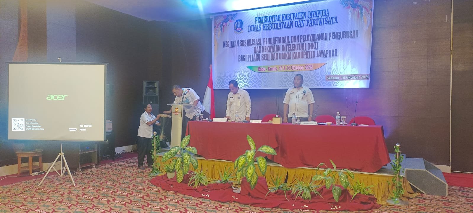 Dan melalui Dinas Pariwisata dan Kebudayaan melakukan sosialisasi, pendaftaran, dan pelayanan pengurusan HKI pelaku seni dan UMKM, di Hotel Grand Alison, Sentani, pada Rabu (15/10/2025).