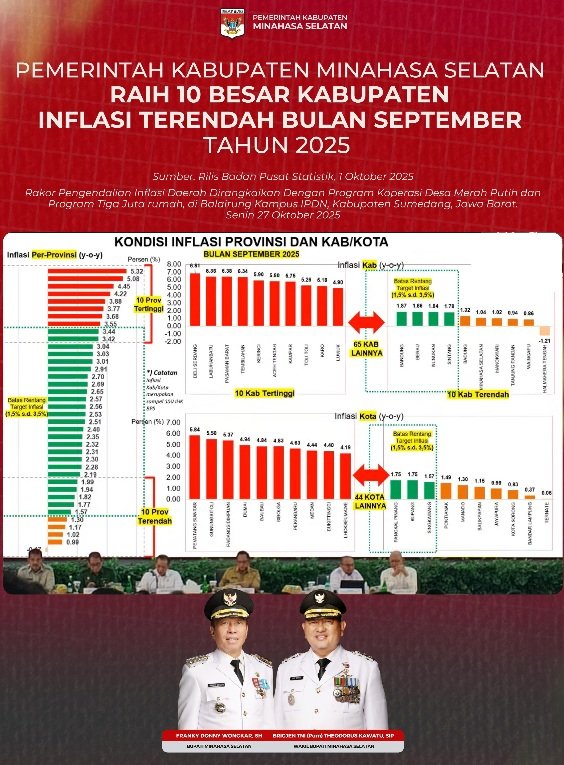 Dalam Rapat Koordinasi (Rakor) Pengendalian Inflasi Tahun 2025 yang digelar Kementerian Dalam Negeri RI (Kemendaagri), Kabupaten Minsel diumumkan masuk dalam 10 besar Kabupaten/Kota dengan tingkat inflasi terendah se-Indonesia.