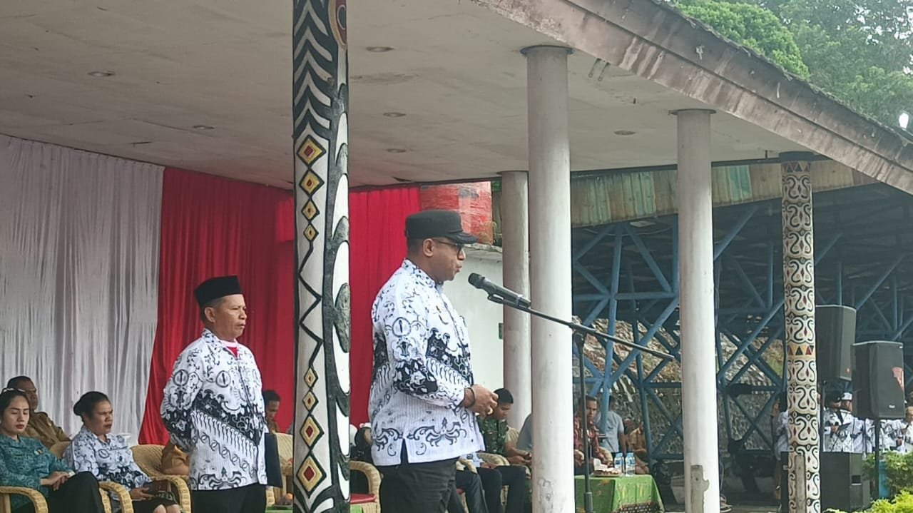 Irup: Asisten I Bidang Pemerintahan Setda Kabupaten Jayapura, Gilberd R. Yakwat, S.STP, sebagai inspektur upacara (Irup) peringatan HUT ke-80 PGRI dan Hari Guru Nasional (HGN) 2025 di Lapangan Apel Kantor Bupati Jayapura, Selasa (25/11/2025).(Foto: ARS)