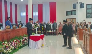 Pelantikan : Ketua DPRK Jayapura, Ruddy Bukanaung, saat melantik Clief Ohee sebagai Pengganti Antar Waktu (PAW) menggantikan almarhum Daud Bati.(Foto: ARS)
