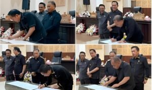 RESMI: Wali Kota Caroll Joram Azarias Senduk SH bersama pimpinan DPRD menandatanganani persetujuan penetapan tiga perda dalam Rapat Paripurna, Sabtu (27/12/2025), bertempat di Ruang Sidang DPRD Kota Tomohon.