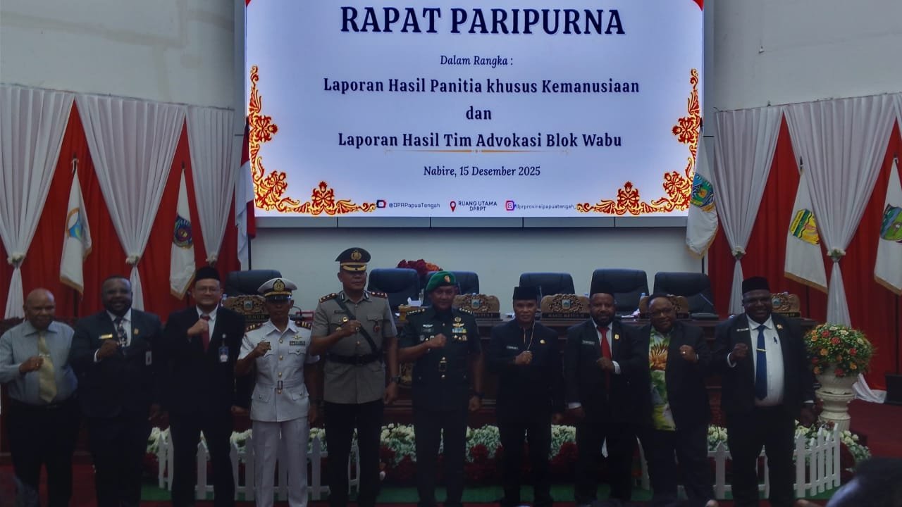 NABIRE, Klikjo.id –Dewan Perwakilan Rakyat Provinsi (DPRP) Papua Tengah menggelar Rapat Paripurna dalam rangka penyampaian laporan hasil kerja Panitia Khusus (Pansus) Kemanusiaan dan Tim Advokasi Blok Wabu, Senin (15/12/2025) sore, di Kantor DPRP Papua Tengah, Jalan Pepera, Kelurahan Morgo, Distrik Nabire, Kabupaten Nabire.