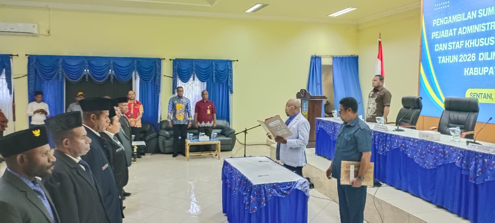 SENTANI, Klikjo.id –Bupati Jayapura Dr Yunus Wonda SH, MH, melantik dua tokoh daerah sebagai Staf Khusus (Stafsus) Bupati Jayapura, bersamaan dengan pengambilan sumpah dan janji sejumlah pejabat lingkup Pemkab Jayapura, di Aula Lantai II Kantor Bupati Jayapura, pada Kamis (22/1/2026).