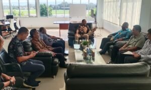 Foto: Kepala Bapenda Kabupaten Jayapura Budi P Yoku, didampingi staf, saat bertemu GM Bandara Internasional Sentani, I Nyoman Noer Rohim, di ruang VIP PT Angkasa Pura Indonesia (InJourney Airports), Kamis (22/1/2026).(ARS)