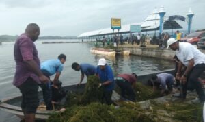 Kerja Bakti : Bupati Jayapura Dr Yunus Wonda, turun mengangkat sampah dan membersihkan rumput di kawasan pesisir Danau Sentani, tepatnya di Dermaga Kampung Yahim, Distrik Sentani.(Foto: ARS)