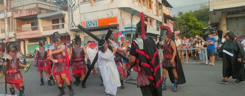 Drama: Penampilan drama alegori Jemaat GMIM Yordan Lewet saat menggambarkan Yesus memikul salib dalam Pawai Paskah GMIM Wilayah Amurang Satu.(Wen)
